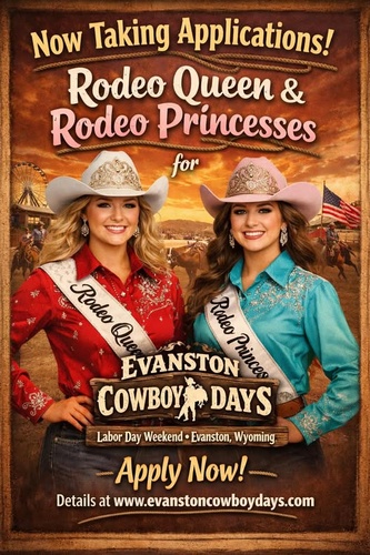 Event Description:Completed application, photographs, and sponsor fee must be turned in no later than 5 pm on Wednesday, June 10, 2026. If mailing, it must be postmarked no later than Monday, June 8, 2026. Please mail or turn in application to:Location:Uinta County Fairgrounds- Exhibit Hall 122 Bear River Drive Evanston, WY 82930Date/Time Information:Saturday, June 20, 2026Contact Information:Sherrie Bradley 307-677-6508Fees/Admission:$200 sponsor fee (Checks payable to Evanston Cowboy Days Royalty)Set a Reminder: