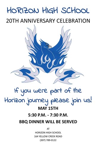Name: Horizon High School 20th Anniversary CelebrationDate: May 15, 2026Time: 5:30 PM - 7:30 PM MDT