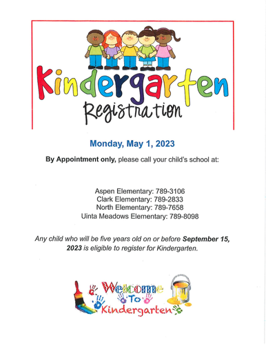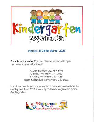Event Description:Kindergarten Registration is Friday, March 20, 2026By Appointment only, please call your child's school at:Aspen Elementary: 789-3106Clark Elementary: 789-2833North Elementary: 789-7658Uinta Meadows Elementary: 789-8098Any Child who will be five years old on or before September 15, 2026, is eligible to register for Kindergarten.Viernes, el 20 de marzo de 2026. Por cita solamente, pro favor llame su escuela que pertenece a su estudiante:Aspen Elementary: 789-3106Clark Elementary: 789-2833North Elementary: 789-7658Uinta Meadows Elementary: 789-8098Los niños que han cumplido cinco años en o antes del 15 de septiembre de 2026 son aceptados para registrarse en Kindergarten.Location:By appointment only
