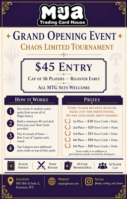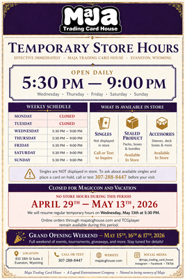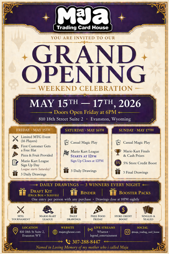 Name: Maja Trading Card House Grand OpeningDate: May 15, 2026Time: 6:00 PM - 11:00 PM MDTWebsite: http://majatcghouse.com