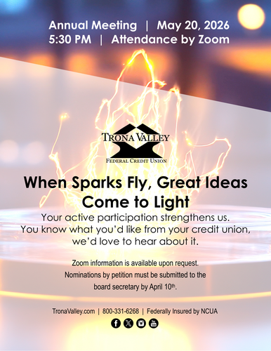Name: Trona Valley Federal Credit Union Annual MeetingDate: May 20, 2026Time: 5:30 PM - 7:30 PM MDTWebsite: http://TronaVelley.com