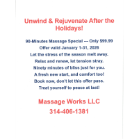Let the stress of the season melt away. Relax and renew, let tension stray. Ninety minutes of bliss just for you. A fresh new start, and comfort too!